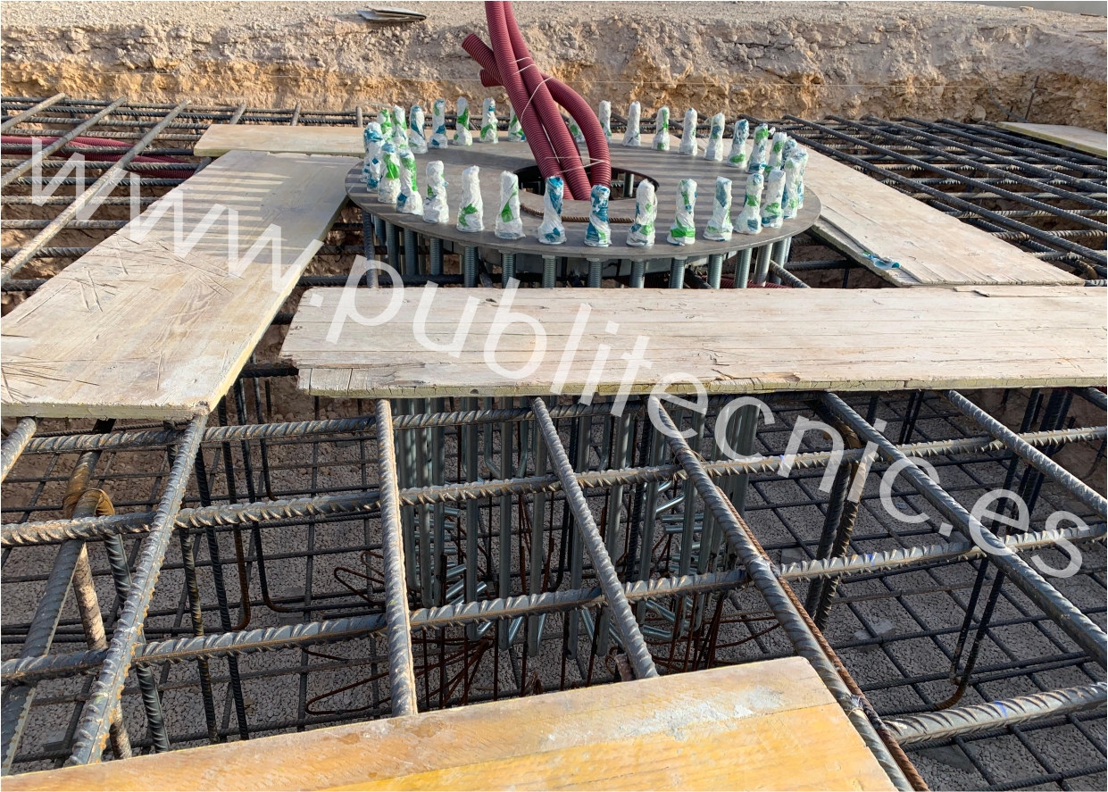 La cimentación de este monoposte publictario de gran formato, está compuesto por una armadura inferior y otra superior mediante corrugado del 20.