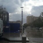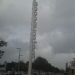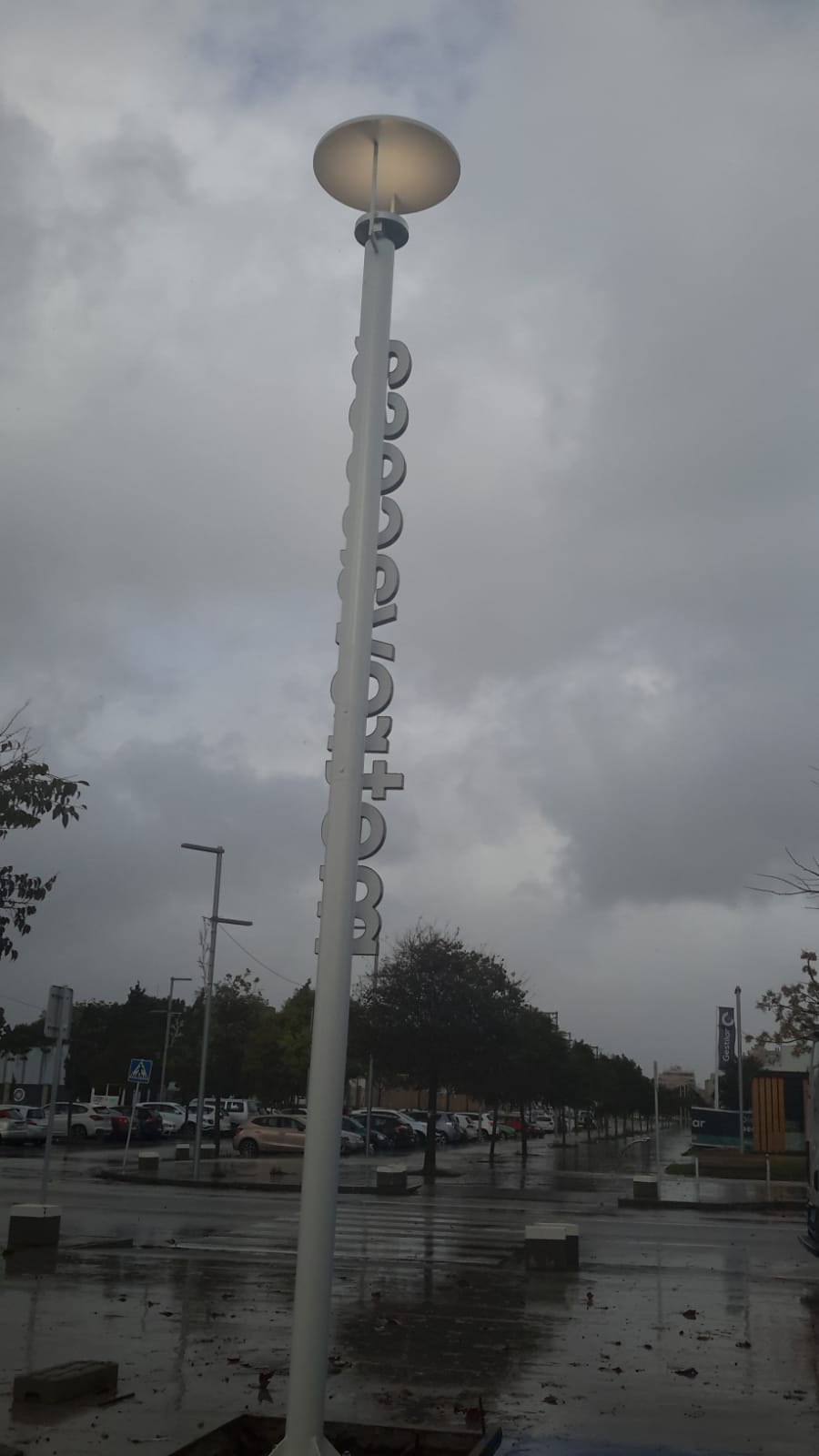 Montaje realizado para Metrovacesa en Mallorca, tótem corporativo de 6 metros de altura coronado por foco modelo Arne con tapa superior metálica